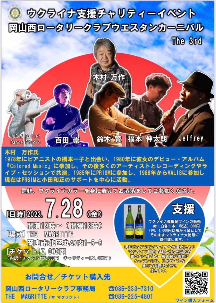 LIVE TAKASHI TOMODA OFFICE TEL/FAX 086-899-8830 MAIL gouz1993@gmail.com Profile 百田 崇 1975年生まれ 岡山県出身 13歳からエレキベースを弾き始める。赤星敬太氏に師事。 高校入学と同時にオリジナルバンド結成。翌年、第7回 TEENS MUSIC FESTIVALに出演、岡山大会グランプリ受賞。 18歳で活動拠点を東京に移す。 卓越した技術で様々なジャンルの演奏に定評がある。 現在は岡山を拠点に、日本を代表するプロドラマー木村万作氏のCrossing_Y のバンドメンバーなど多方面で活躍。 LIVE情報 2022年12月11日 DISCO NIGHT Open 15:00 Start16:00 Charge ¥8,000 VIP席¥15,000 場所 THE MAGRITTE (Vo) OLVIA BURRELL (Vo) JEFFREY QWEST (Dr)木村 万作 (Key) 鈴木 賢 (Gt) 福本 伸太朗 (Ba) 百田 崇 GUEST (Ba) 吉池 千秋 LIVE情報 2023年 7月28日 ウクライナ支援チャリティーイベントOpen 18:00 Start19:00 Charge ¥7,000場所 THE MAGRITTE (Vo) JEFFREY QWEST (Vo) KAKO (Dr)木村 万作(Key) 鈴木 賢 (Gt) 福本 伸太朗 (Ba) 百田 崇 LIVE情報 2023年 7月29日 DISCO NIGHTOpen 15:00 Start16:00 Charge ¥8,000 VIP席¥15,000場所 THE MAGRITTE(Vo) SABRINA PATRICK (Vo) JEFFREY QWEST (Dr)木村 万作(Key) 鈴木 賢 (Gt) 福本 伸太朗 (Ba) 百田 崇
